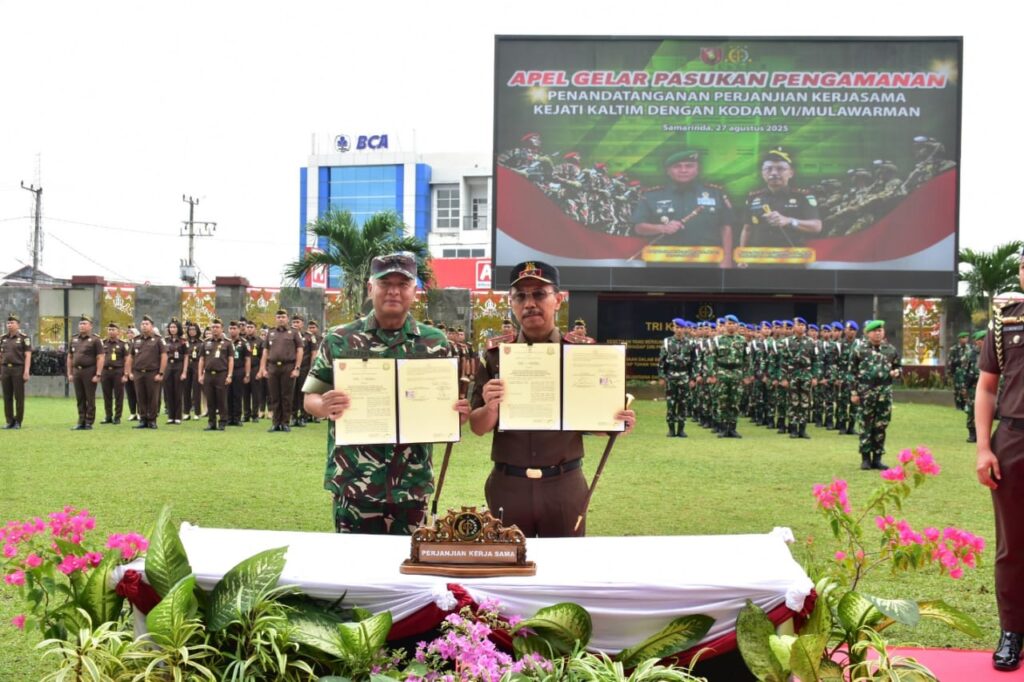 ayobaca.co, Samarinda – Kejaksaan Tinggi (Kejati) Kalimantan Timur bersama Kodam VI/Mulawarman melaksanakan apel gelar pasukan pengamanan sekaligus penandatanganan perjanjian kerja sama di halaman Kantor Kejati Kaltim, Jalan Bung Tomo, Samarinda Seberang, Rabu (27/8/2025).